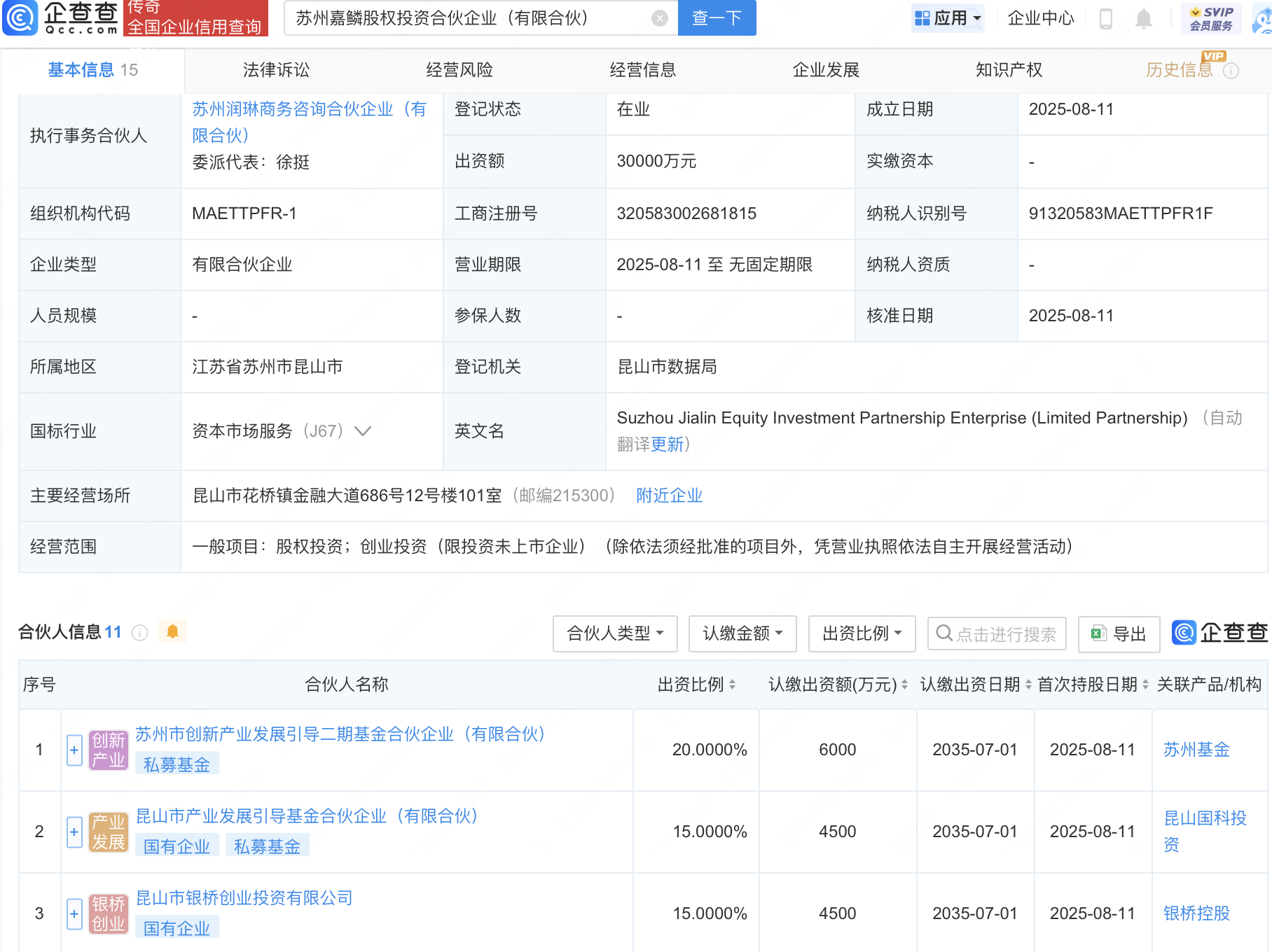 近日,苏州嘉鳞股权投资合伙企业(有限合伙)成立,出资额3亿元,经营范围包含:股权投资;创业投资(限投资未上市企业)。企查查股权穿透显示,该企业由苏州市创新产业发展引导二期基金合伙企业(有限合伙)等共同出资。