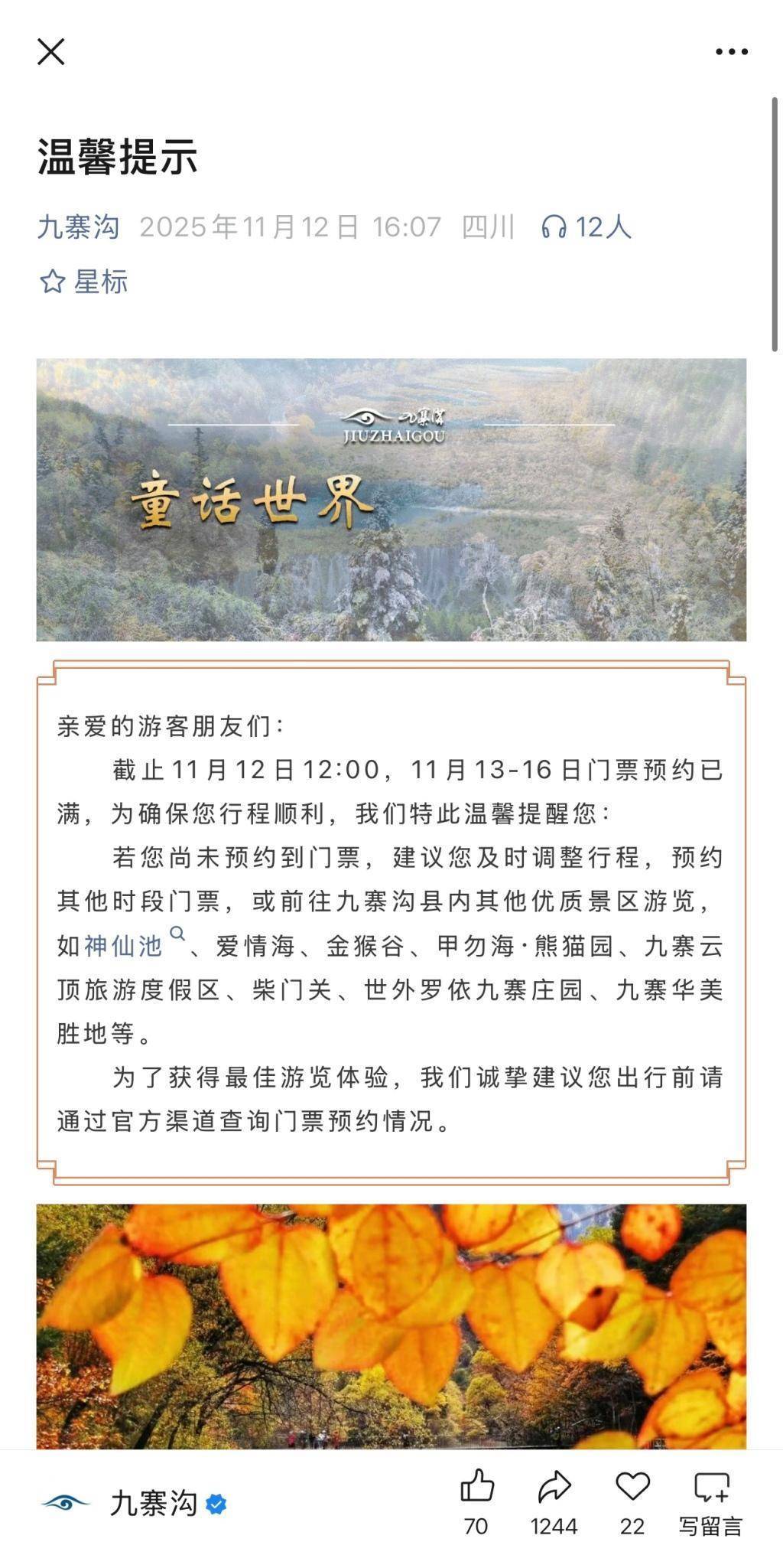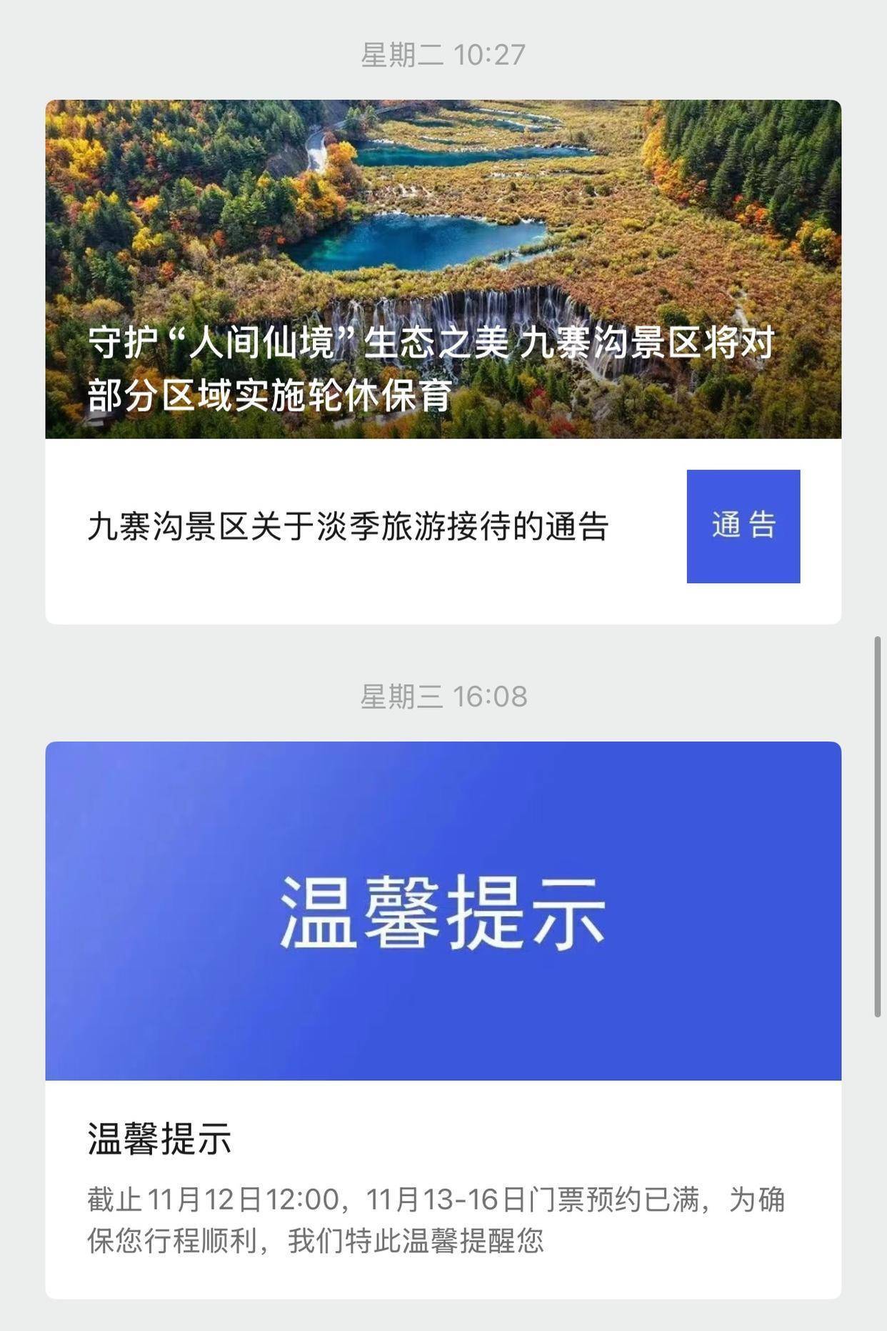 如11月11日,九寨沟刚发布《九寨沟景区关于淡季旅游接待的通告》,11月12日就发布《温馨提示》称,截至11月12日12:00,11月13-16日门票预约已满。